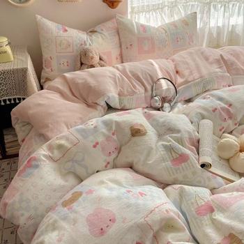 फैशन डबल-पक्षीय सिलाई रंग 4-इन-1 टुकड़े धोने योग्य सूती बिस्तर शीट डवेट सेट